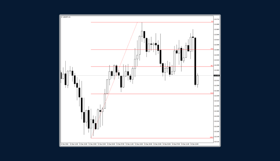 - 第二步 – 在底部附加斐波那契回撤工具,并将其向右拖动,一直拖到顶部